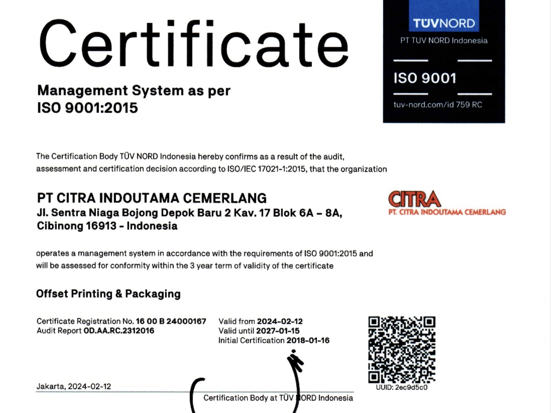 PT. Citra Indoutama Cemerlang (CIC) merupakan perusahaan swasta yang bergerak dibidang Offset Printing & Packaging. Sebagai perusahaan lokal CIC merupakan solution Graphica yang membantu kegiatan usaha dalam pekerjaan packaging, promosi, continous form, dan yang lainnya. CIC diharapkan mampu untuk memenuhi permintaan pasar dan siap bersaing dengan perusahaan lokal maupun internasional lainnya dengan menerapkan strategi fokus pada permintaan pasar, tehnik produksi, biaya efektif serta alat manajemen guna peningkatan kinerja dan hasil produk biaya bersaing.
